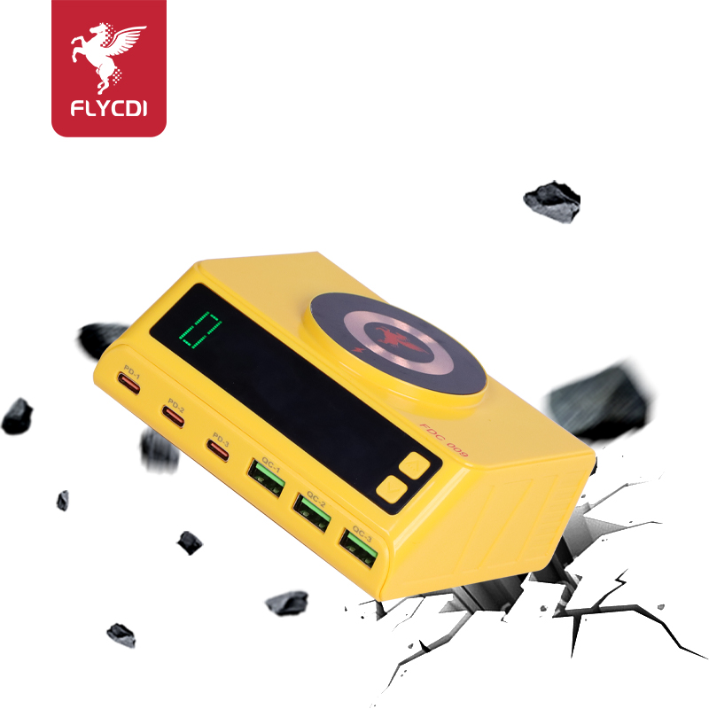 FLYCDI FDC-009 delivers 110W total output across 6 ports with wireless charging, smart display, and built-in protection—all in a bold yellow design.