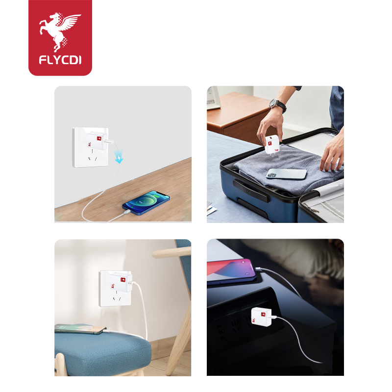 Compact and versatile, the FLYCDI single-port fast charger series delivers reliable power from 12W to 65W with global plug options.