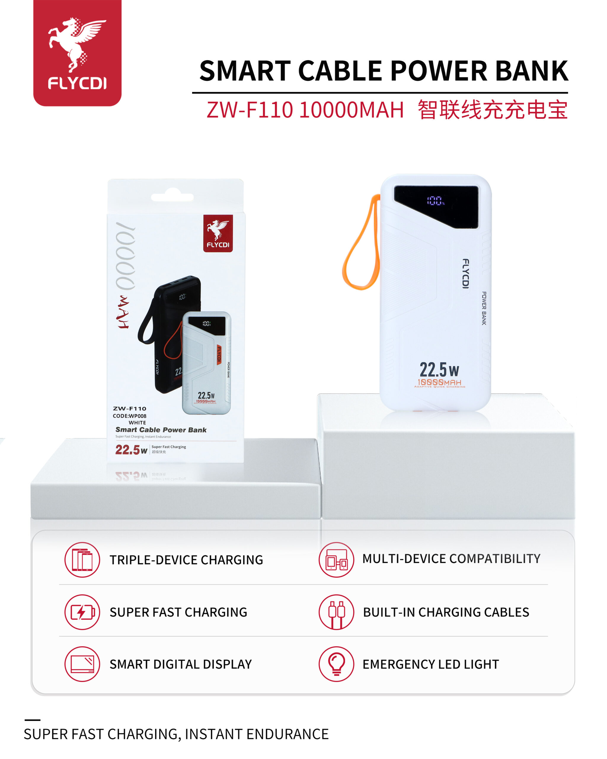 FLYCDI Smart Power Bank 10000mAh – ZW-F110 (22.5W, LED Display, Built-in Cables)