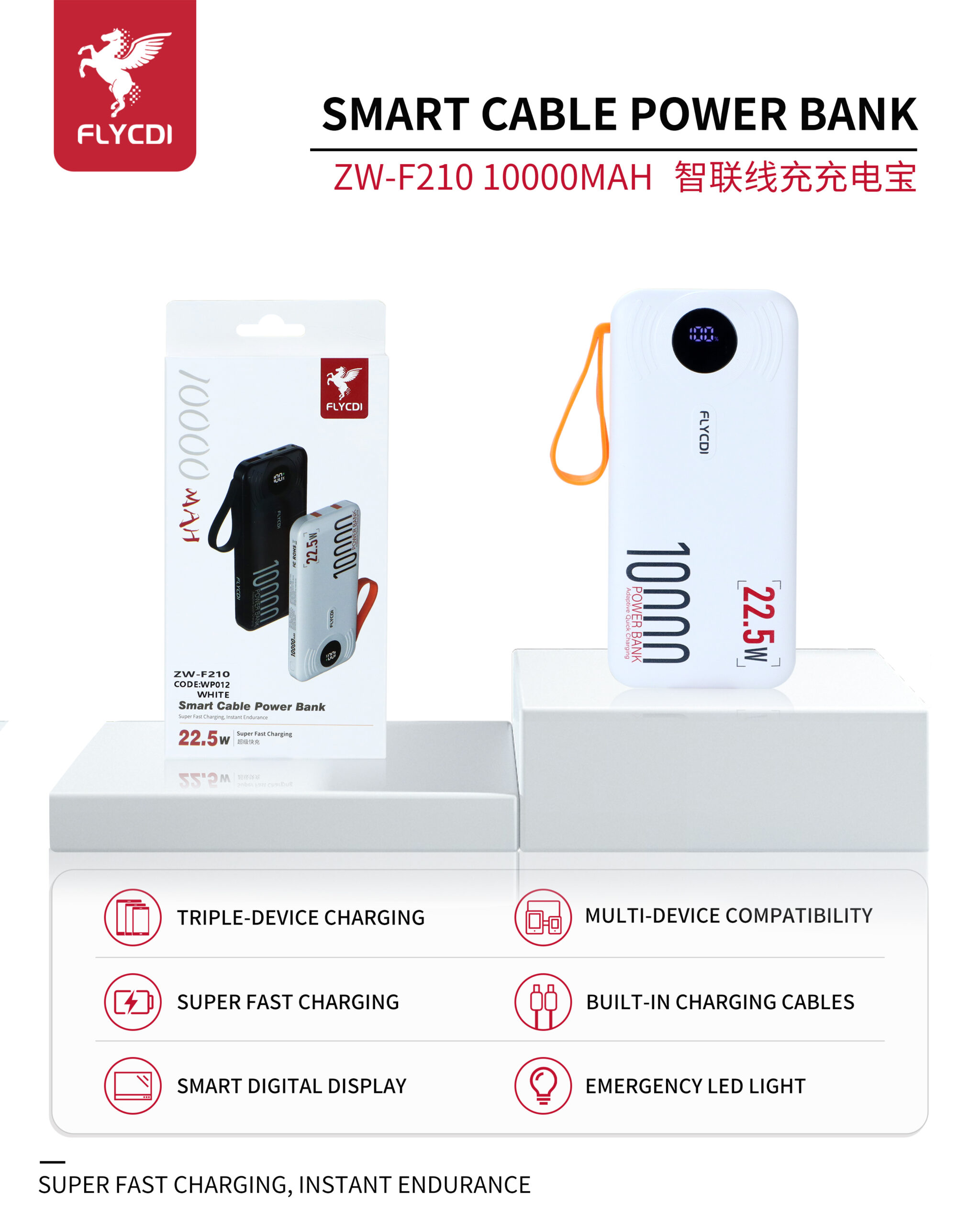 FLYCDI Smart Power Bank 10000mAh – ZW-F210 (Triple Output, LED Display, Built-in Cables)